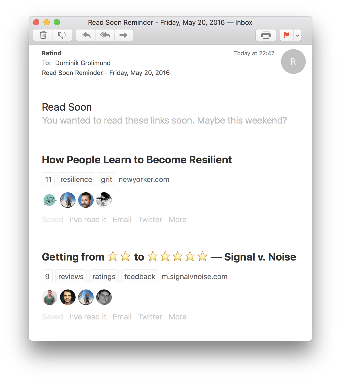 read-soon-reminder.png 262.4 KB The Read Soon reminder email will be sent on weekends and will remind you of links you added recently. Remember: Links on Read Soon will drop off the list after two weeks (and get tagged read someday).