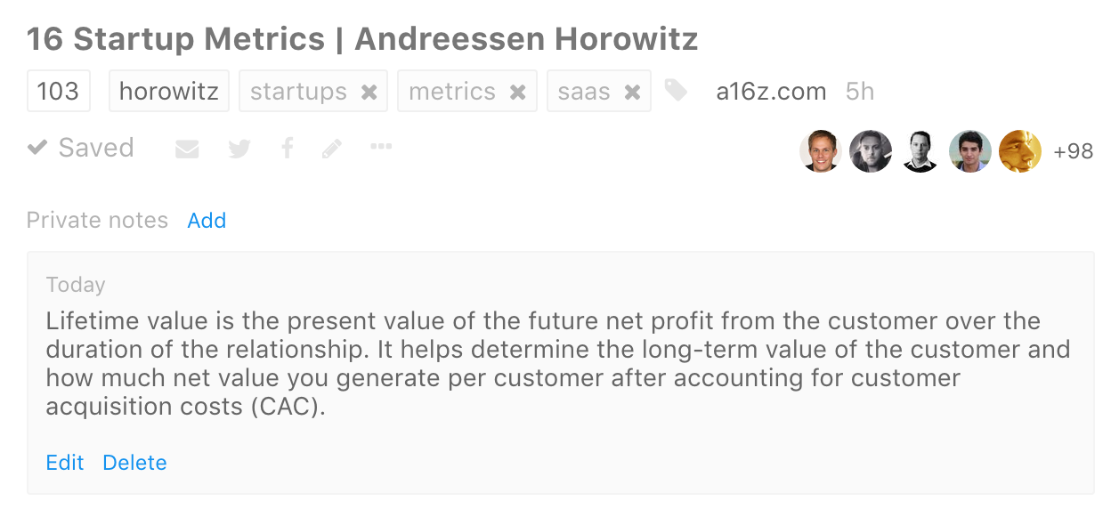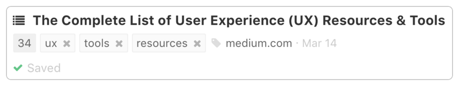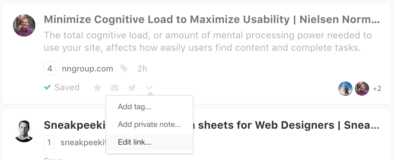 edit-link.png 128.85 KB You can now also edit the page title and add a description by clicking the "More" icon (arrow down) under links you've saved. With the recent features "private notes" and "unlimited tags", links are now fully editable and searchable.