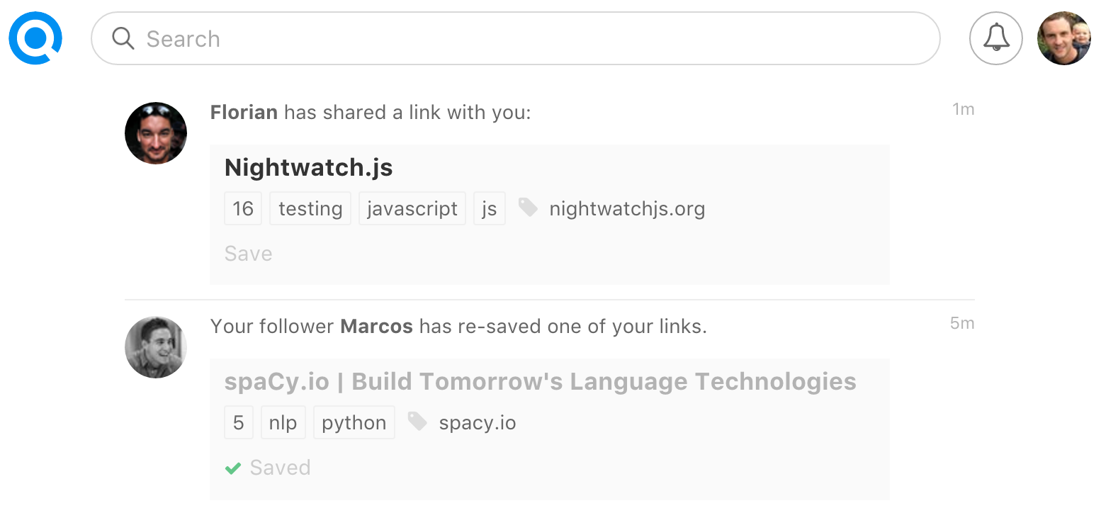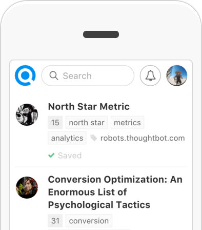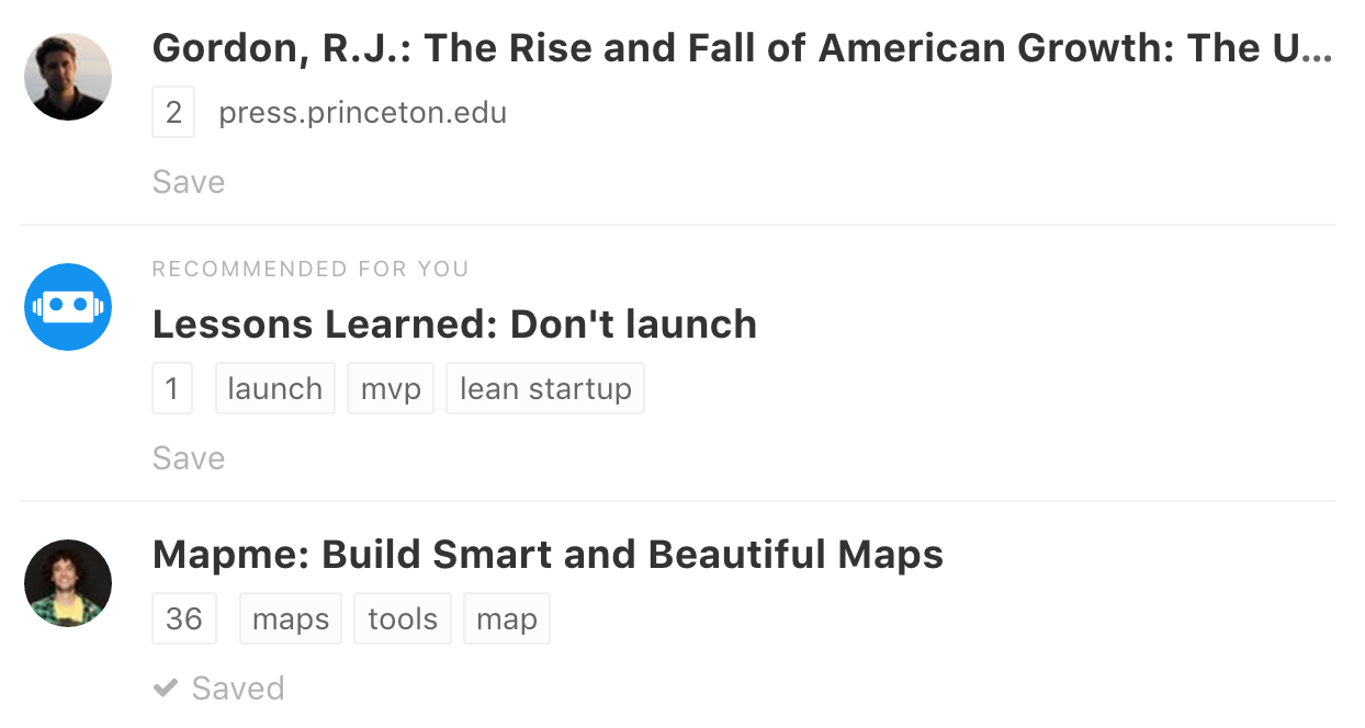 Refind adds a new dimension to discovery with personalized recommendations. The Refind Bot analyzes your links and – every now and then – digs out a must-read classic specifically for you and inserts it into your feed. The more links you save, the more personalized recommendations you'll get.